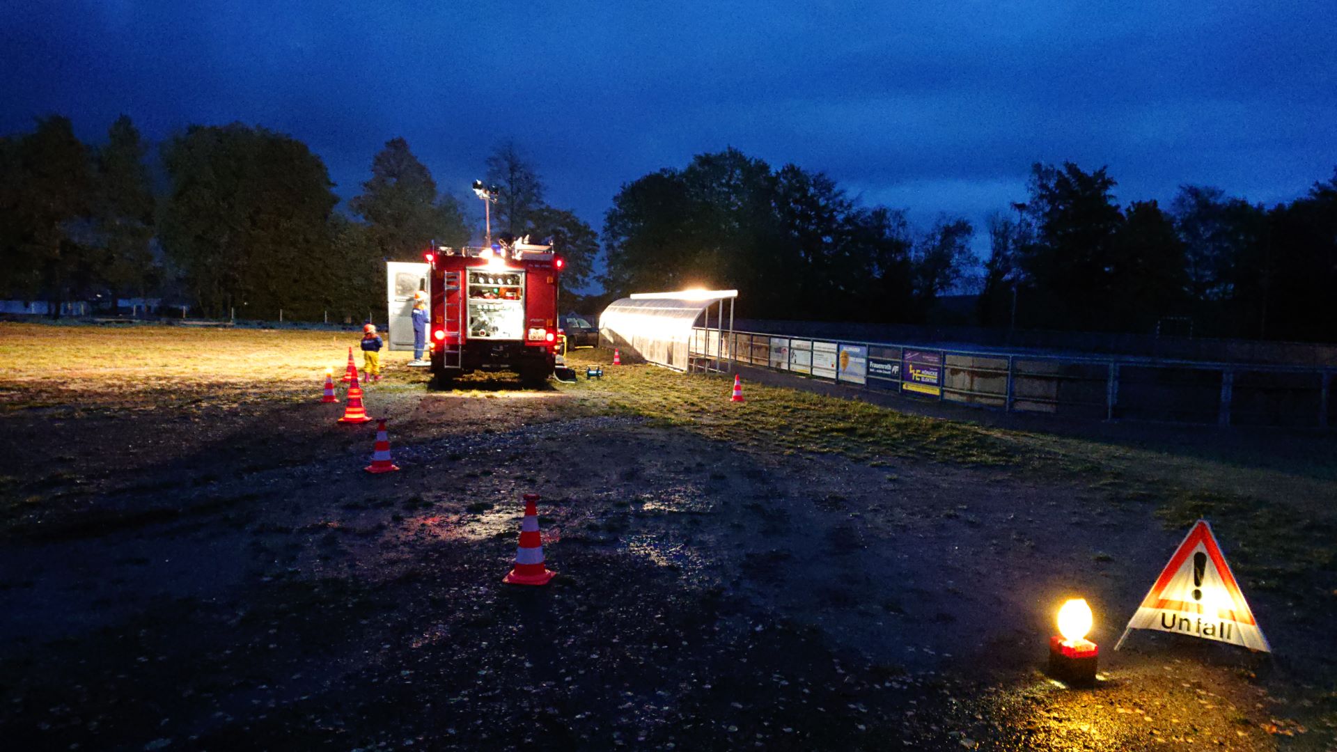 Bei allen diesen Einsätzen ist es wichtig, die Einsatzstelle richtig abzusichern und auszuleuchten. Als erstes wurden die auf unserem Feuerwehrfahrzeug zur Verfüg stehenden Materialien angeschaut und deren Funktion besprochen. Anschließend ging es in die Übungslage „verunfalltes Fahrzeug auf einer zweispurigen Straße“. Dazu hatte ein Kamerad sein Auto auf dem großen Sportplatz abgestellt. Wie bei einem richtigen Einsatz – inklusive Einsatzfahrt – sollten die Kinder und Jugendlichen das Unfallfahrzeug und die Einsatzstelle gegen den Verkehr absichern und anschließend ausleuchten. Zuerst wurden Blitzleuchten und Verkehrskegel richtig abgestellt. Danach galt es mit Unterstützung der Jugendwarte, die Stromversorgung und der hydraulische Lichtmast auf dem Dach des Hilfeleistungslöschgruppenfahrzeugs aufzubauen. Schnell war klar, dass eine Lichtquelle nicht genügte. Nach dem Motto „sehen und gesehen werden“ muss die Einsatzstelle möglichst schattenfrei sein. Alle wurden für das Auf- und Abbauen des mobilen Lichtmastes geschult und die Betreuer zeigten zudem auf was man bei dem Ausleuchten noch achten sollte.