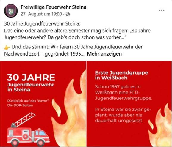 Wie man sieht, ist das Angebot in unserer Jugendfeuerwehr vielseitig: Brand- und Rettungsdienstwissen, Erste Hilfe, Brandschutzaufklärung, Technik- und Ausrüstungswissen sowie Teamübungen, realistische Einsätze, Übung der Zusammenarbeit mit anderen Jugendfeuerwehren der Umgebung, Wettkämpfe, Zeltlager, und Projekte etc. Der investierte Aufwand durch unsere Jugendwarte ist enorm, zahlt sich aber dadurch aus, dass über die zurückliegenden 30-Jahre nahezu jedes zweite Jugendfeuerwehrmitglied zum aktiven Feuerwehrmann geworden ist. Und genau dafür – eigentlich nur dafür – machen wir das. Die Feuerwehr Steina lebt davon, dass interessierte Jugendliche zunächst den Weg in die Jugendfeuerwehr finden und dann dort, durch die beschriebenen Angebote, hängen bleiben.