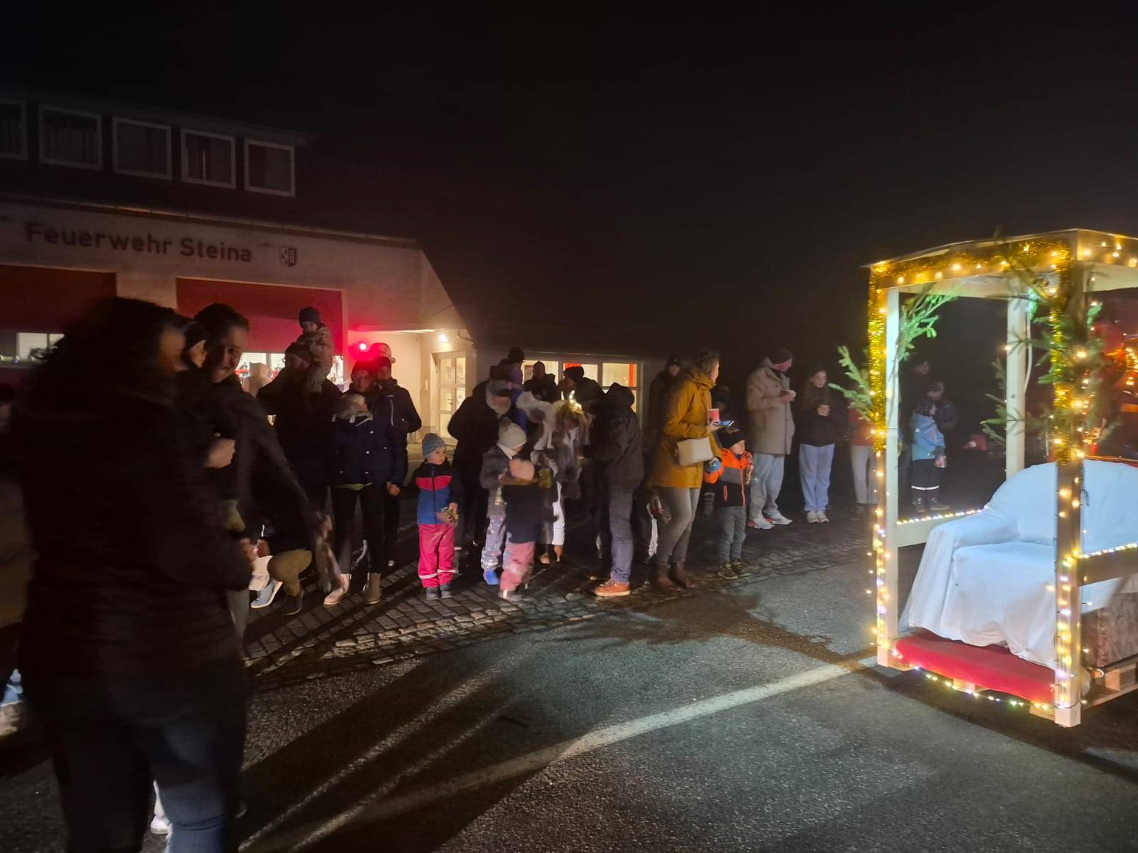 Auf einem wunderschön beleuchteten Traktor, der schon von weitem festlichen Glanz verbreitete, fuhr der Weihnachtsmann von Station zu Station. Insgesamt fünf Haltepunkte hatte die liebevoll organisierte Tour, an denen die Bewohnerinnen und Bewohner von Steina herzlich empfangen wurden. Dort gab es Glühwein, Kinderpunsch und kleine Leckereien, die für gemütliche Stimmung sorgten. Die Kinder freuten sich sichtlich über den Besuch des Weihnachtsmanns und nahmen die kleinen Überraschungen begeistert entgegen. Für die Sicherheit entlang der Strecke sorgte die Feuerwehr Steina, die den festlichen Konvoi begleitete und dafür sorgte, dass die Tour reibungslos und sicher verlief.